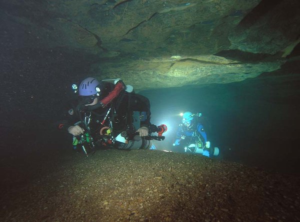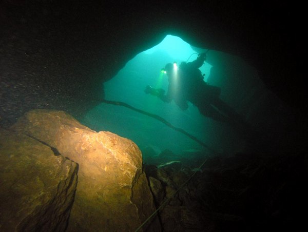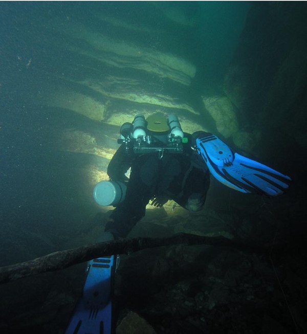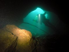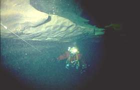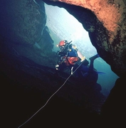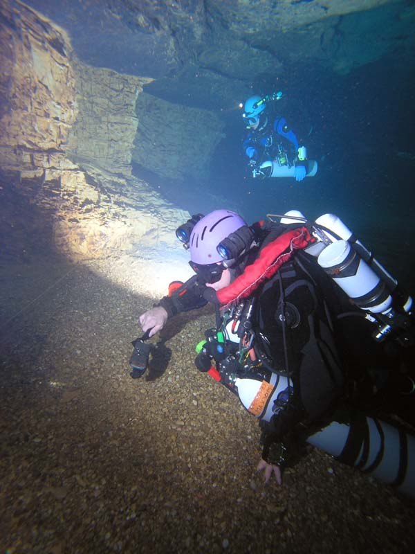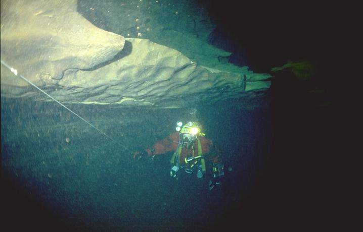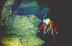 Galerie : à partir du fond du bassin, à -3m, un ressaut vertical mène jusqu'à-6m. L'entrée de la galerie se fait suivant un joint de strate encombré d'un cone d'éboulis (largeur 3 m.,hauteur 0,80 à 1,30 m.) et dont la pente est d'environ 30°.