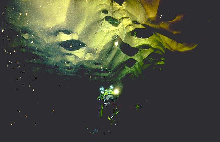 Au-delà de 60, le couloir de section carrée se prolonge horizontalement en forme de tunnel avec un diamètre denviron 4m. Après 40m, le fond est rompu brusquement par un puits surplombant e 10m de diamètre, en forme de coquille géante. Il descend dun seul jet à 88 où la galerie reprend sa direction originelle : nord. Un talus de galet en pente raide dabord, saplanit avec des coupoles au plafond.