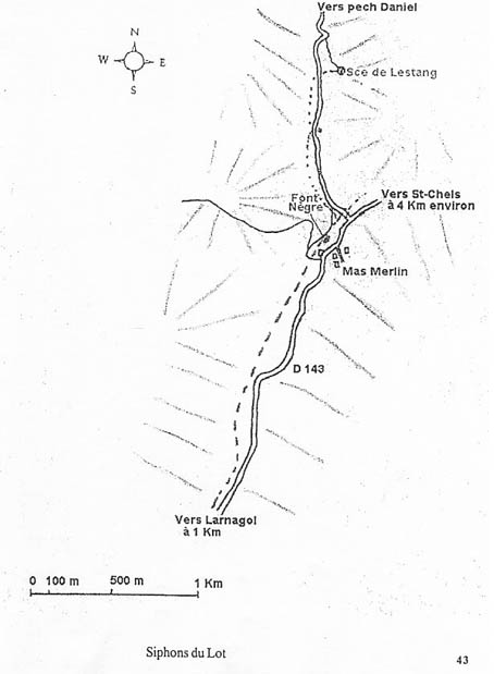 | Situation Sur la route de Larnagol à St Chels, à 3km de Larnagol après le mas Merlin, prendre la petite route à gauche , puis remonter la petite vallée jusqu'au bout (2km de la D143). Au moment où la route tourne à droite et commence à monter, prendre un petit chemin montant. La fontaine se trouve au bout de ce chemin (175m), au pied d'une petite falaise derrière un buisson de ronce. Description