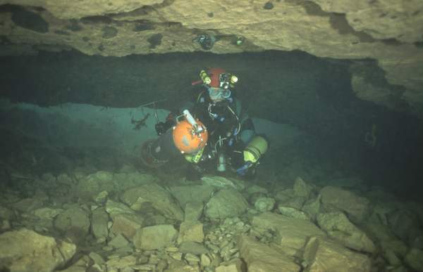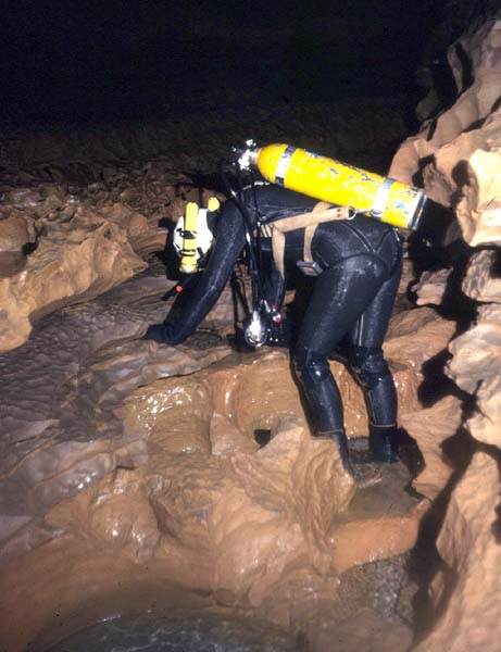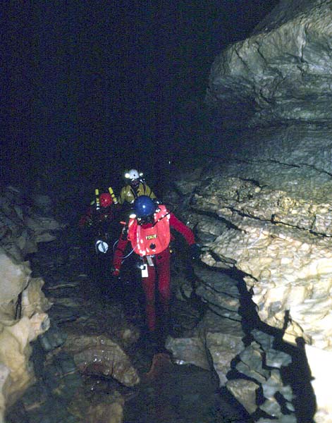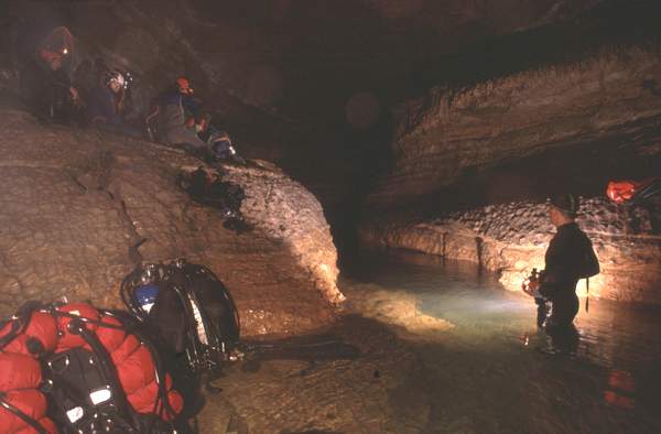 En périodes de hautes eaux, le premier siphon s’étire sur 195m (-6,5), avec plusieurs cloches d’air allongées.