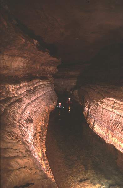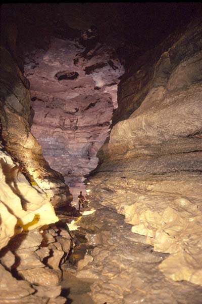 La galerie se poursuit au delà sur 187m. Le plafond s'élève (10 m) et le parcours s'effectue dans un cayon très corrodé et surcreusé par de petites marmites parfois profondes d'un mètre. Un talus de sable très pentu accompagné d'un abaissement de la voûte débouche sur le 2e siphon.