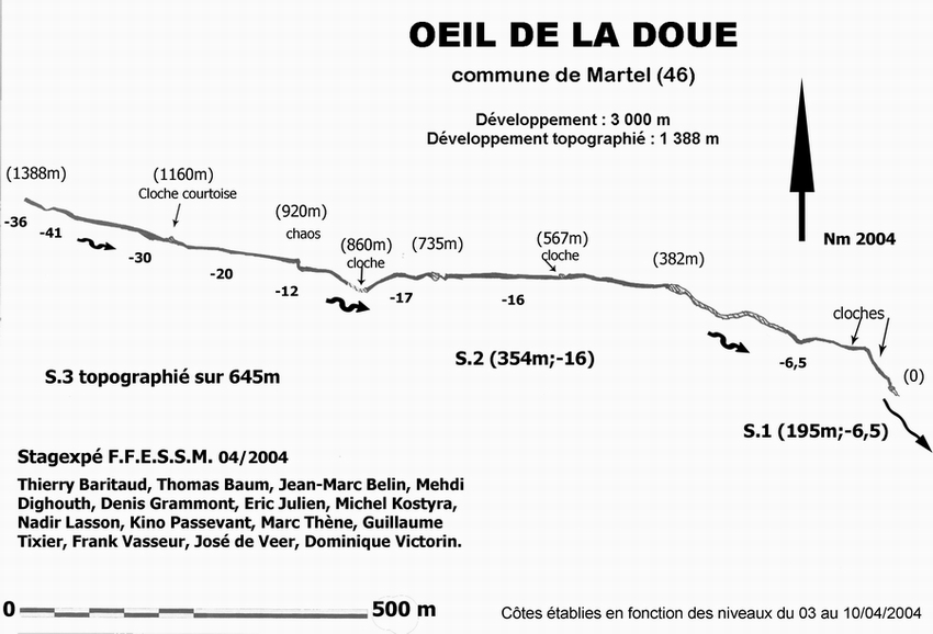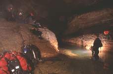 7m plus loin, le siphon suivant. Le S.3 (1380m ; -52) débute par une galerie plus modeste (4 x 3m) qui émerge dans une longue cloche (30m) à 110m du départ après un passage à –17.