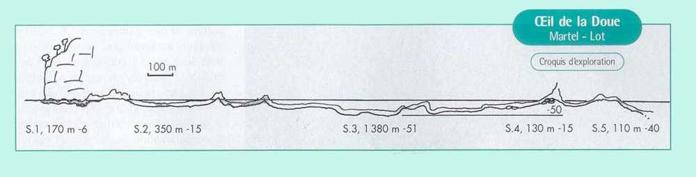 Le S.2 (354m ;-16) peut être effectué au tuba sur 50 m. si le niveau du siphon est bas. I1 a une profondeur de 6 m. sur les 100 premiers mètres, puis descend progressivement à -11 m. A 185m du départ, une vaste cheminée s’amorce en rive gauche. Elle émerge dans une cloche sans suite de 7 à 8m de long pour 3 à 4 de large et 4 à 5 de haut, en forme de haricot. Une alcôve abriterait éventuellement une amorce de galerie.