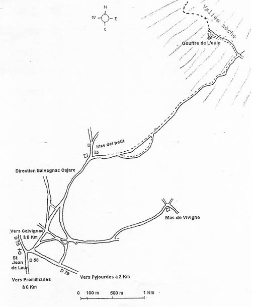 A partir de Cajarc, prendre la D19 qui mène au sud en traversant le Lot. A l'intersection avec le D79 (à environ 8km de Cajarc), prendre à gauche vers St Jean de Laur. Dirigez-vous vers le centre de St Jean de Laur puis prenez au nord au niveau de l'église, direction le hameau 'Mas del Petit'. Juste avant le Mas del petit, il y a une fourche, prenez l'embranchement de droite sur une mauvaise piste (il se peut que votre véhicule n'apprécie pas). La piste descend dans une vallée et mène au lit asséché d'un cours d'eau. L'entrée de la cavité se situe en aval , près de la fin de la piste , sur la gauche.