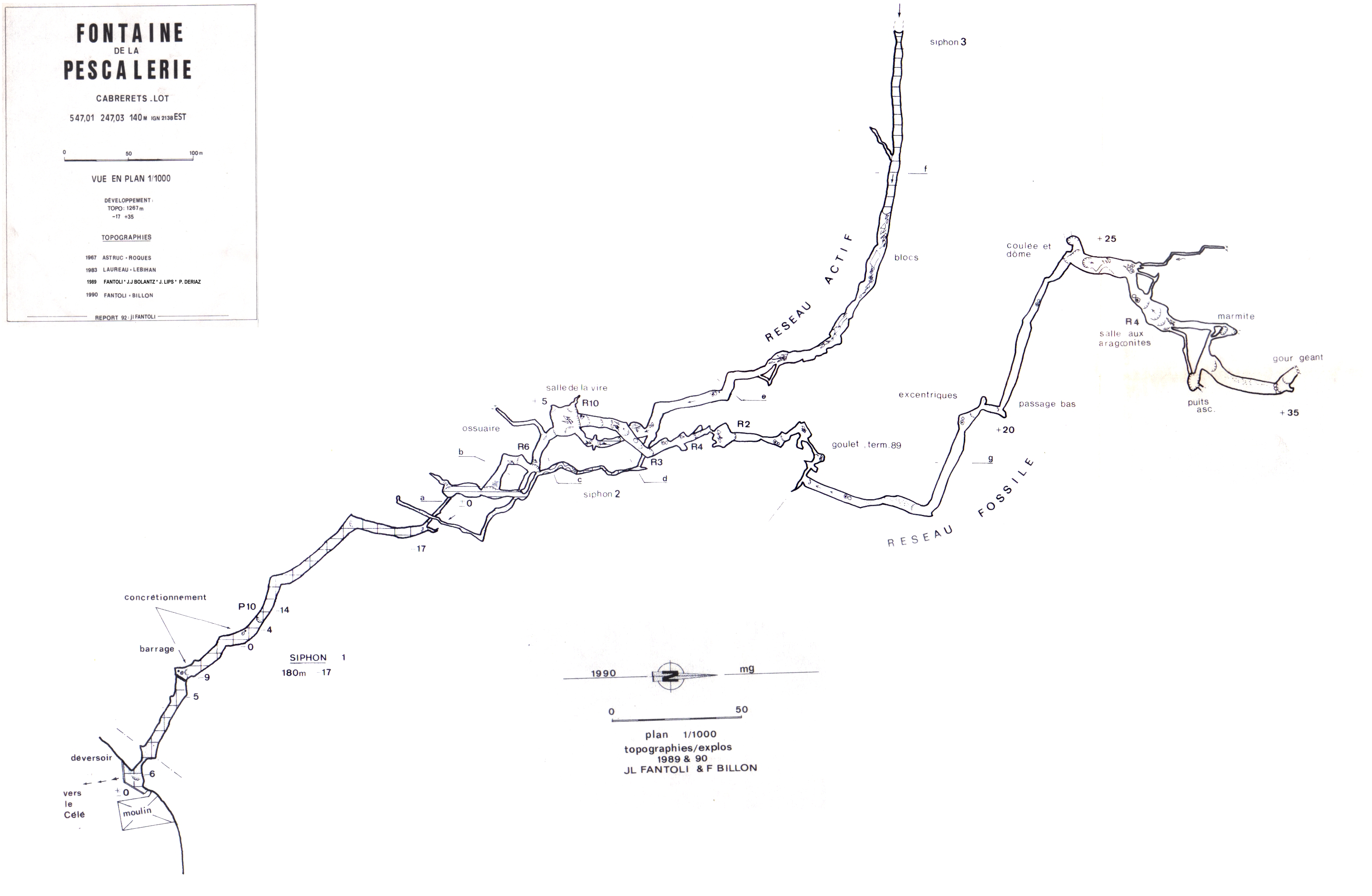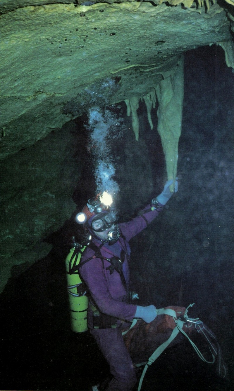 Plongée du S1 avec Francois Billon le 5 septembre 1990. Escalade et équipement (1spit) du goulet, puis une belle exploration du réseau sur plus de 445 mètres, arrêt dans la galerie principale sur une colmatage de concrétions.
