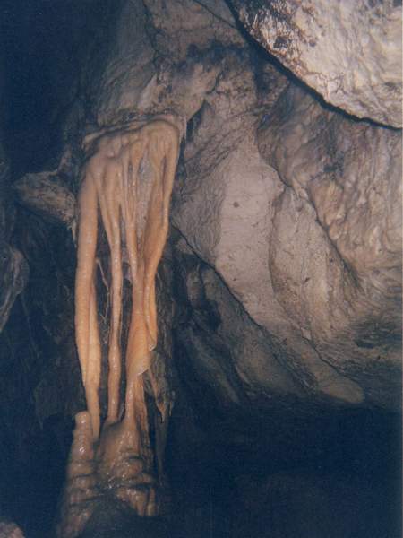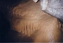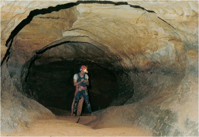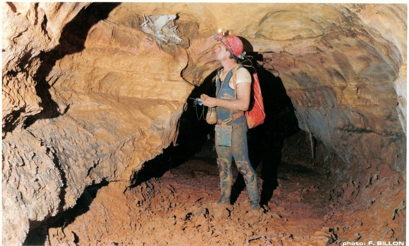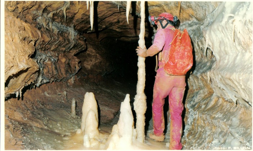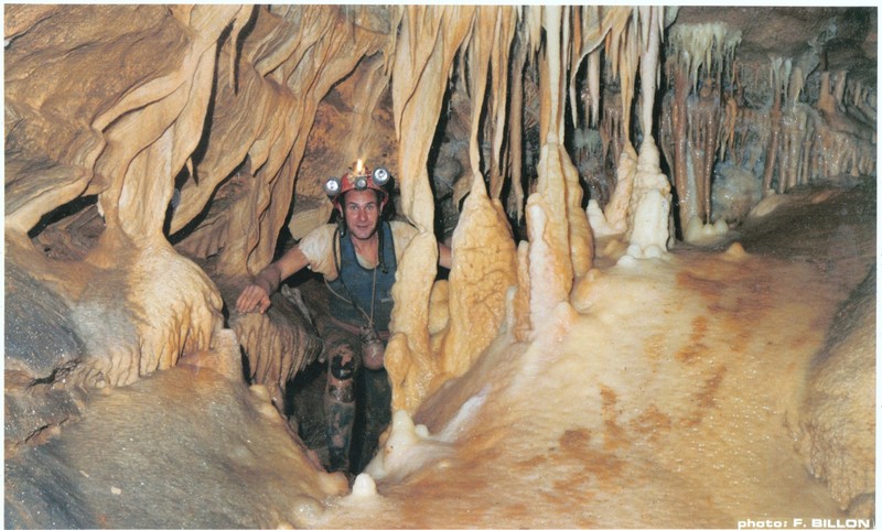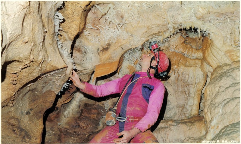 Avec l'aide en assurance de Josiane, j'entame l'escalade (salle de la Vire) et parvient à découvrir à une dizaine de mètres en hauteur la suite tant attendue du réseau souterrain. Je viens à parcourir sur une centaine de mètres vers l'amont une trés belle galerie fort concrétionnée.