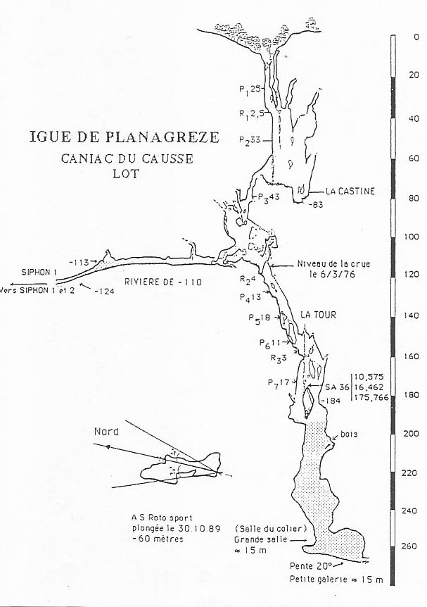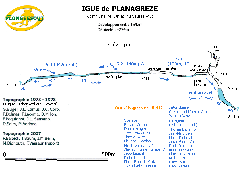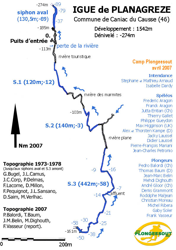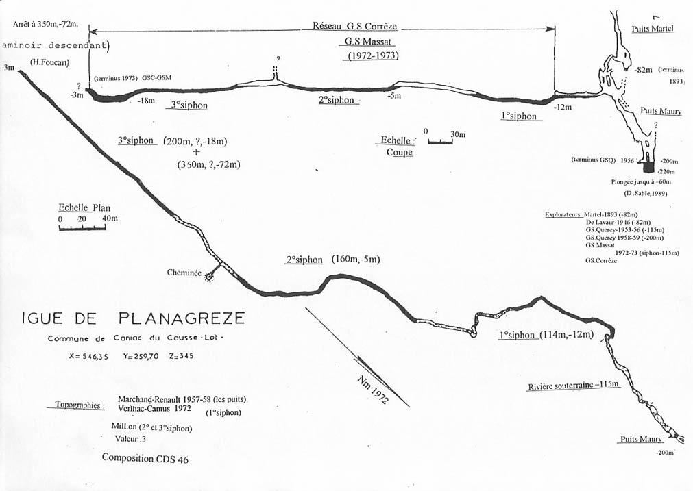 Historique 1983 – E.A. Martel atteint -80 m. Les plongée de la rivière de -110 m. Le 1er mai 1972, M. Thomas, J.P. Willehm, M. Verlhac et D. Millon, franchissent le S1 et progressent sur une courte distance derrière celui-ci. En août 1983, J.L. Fantoli rajoute 30 m à une profondeur de -20 m. Le 28 et 29 octobre 1984, P. Jolivet progresse de 60 m, arrêt à -29 m. Plongée en 2 * 12 litres Du 11 au 14 juillet 1986, H. Foucart atteint -55 m (vue à -65), 70 m de fil déroulé. Arrêt sur étroiture en bi 15 litres. G. Morieux explore un affluent rive droite à 250 m dans le S3 (-15 m) sur 150 mètres, arrêt à -12 m sur colmatage. Les 26 et 27 avril 1994, H. Foucart descend dans le laminoir avec deux bouteilles de 12 litres d'air portées en latéral et atteint -70 m. En avril 2007, l'équipe Plongeesout effectue 6 plongées en recycleur jusqu'au laminoir situé dans le S3 à -55m, sans parvenir à le franchir. Toute la topo sera levée et des photos et films seront réalisés. Les plongées du lac terminal à -200 m Les 3 et 4 février 1989, Denis Sablé atteint -52 m en 2 * 7 litres En avril 2007, l'équipe Plongeesout effectue 3 plongées en recycleur. Arrêt sur rien à -89m Description L'entrée du gouffre donne accès à :