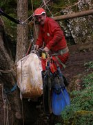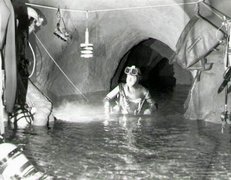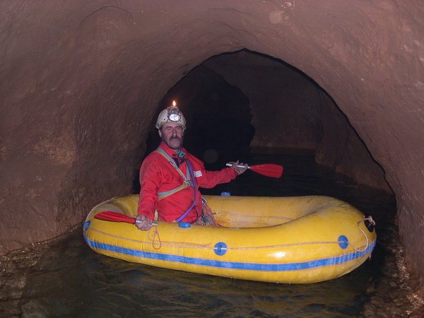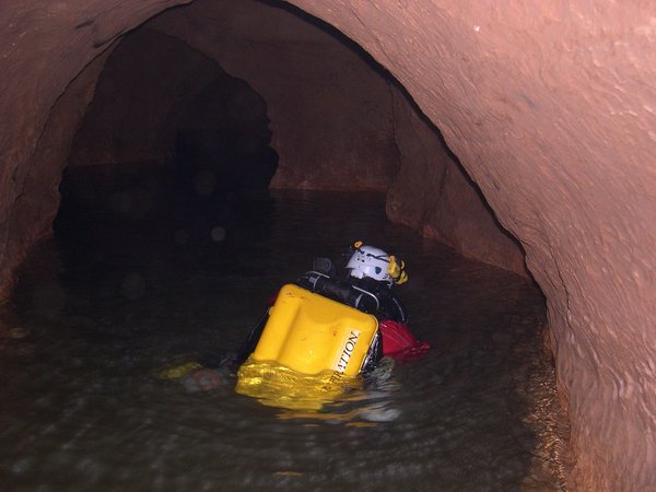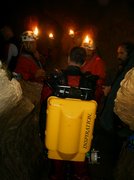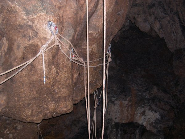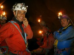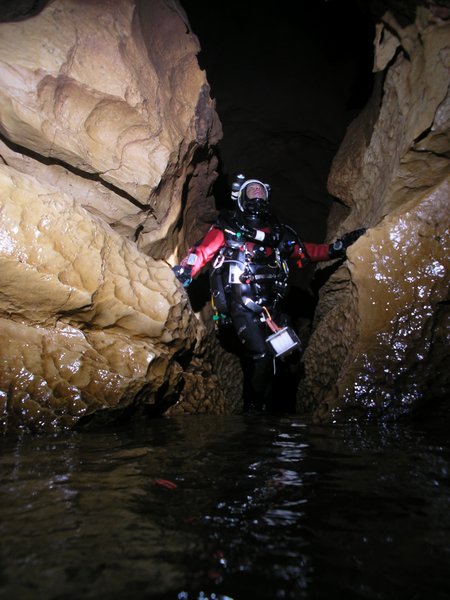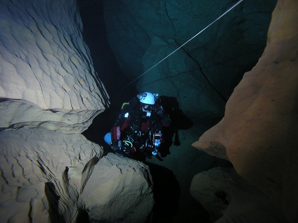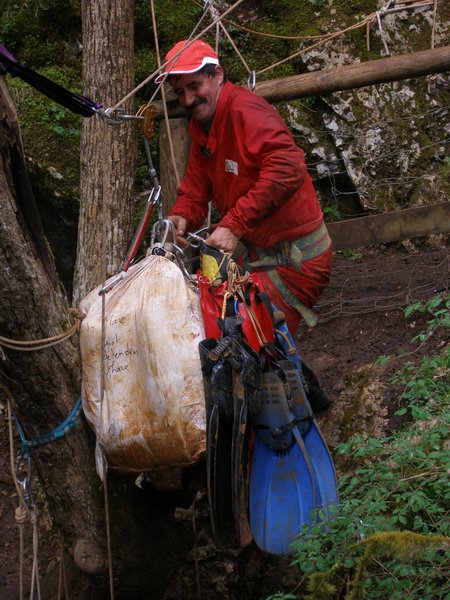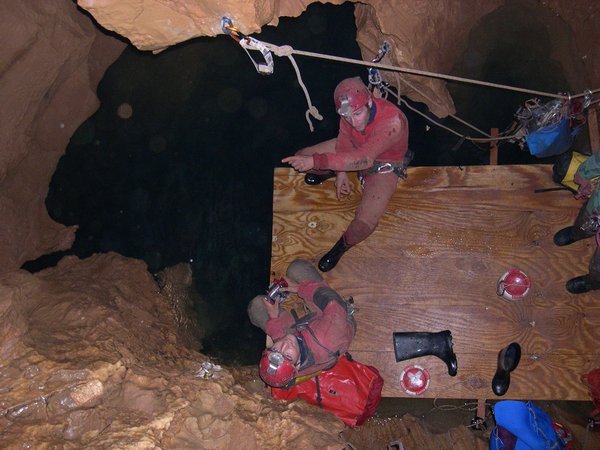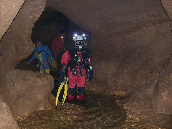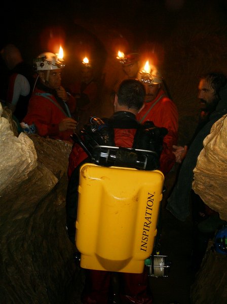 Le troisième siphon sinue dans un eau toujours critalline. Le manque d'amarage a conduit à tirer le fil au plus court. Celui-ci recoupe donc régulièrement la galerie et le plongeur devra fréquemment passer dessus ou dessous. Le Lac A partir de la rivière de -110m, il faut encore descendre jusqu'à -185m pour atteindre le lac. Une plateforme y a été installée en avril 2007 afin de rendre la mise à l'eau plus confortable. Le niveau de l'eau varie constament et très rapidement. Un petit orage l'a fait monter de deux mètres dans la nuit ! Les parois sont recouvertes de concrétions d'argile qui s'éfritent dès qu'on y touche et qui anihile la visibilité. Sous les surplombs, on trouve d'étonants "oeufs de paques" d'argile qui ne demandent qu'à se détacher pour aller s'éclater plus bas et transformer le lac en cloaque. Les dimensions sont vastes et le puits descend presque verticalement jusqu'à 65m ou la pente diminue et donne naissance à une galerie poursuivie jusqu'à -89 mètres. A cette profondeur, la visibilité redevient meilleure (3 à 4 mètres). Arrêt sur rien. |
