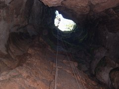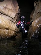 La rivière suspendue C'est une magnifique rivière d'eau critalline qui se perd entre des blocs. On entendre son cheminement dans les profondeurs de la cavité. Le 1er siphon fait 120m/-12. La roche est très propre et seuls quelques sédiment sur le sol viendront légèrement troubler le retour. Le conduit est très sinueux et offre un joli paysage minéral. A la sortie, un petit ressaut d'un mètre mène au passage exondé séparant le S1 du S2. Les 103 mètres de galerie exondée sont de toute beauté. Son franchissement est un peu physique et il y a parfois un peu CO2. Le 2ième siphon fait 140m/-3.Sa sortie, en pente douce, se transforme en rivière aquatique peu profonde d'environ 80m qui se franchit sans réelle difficulté. En rive droite, on notera un petit affluent.