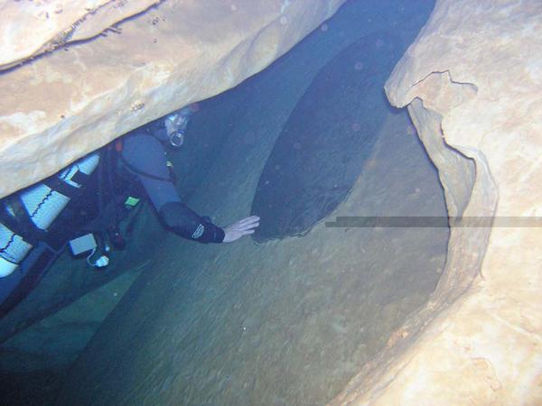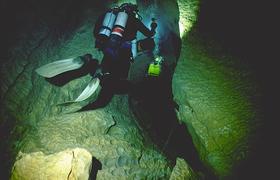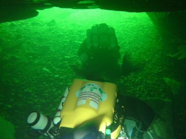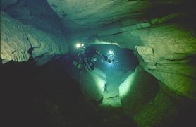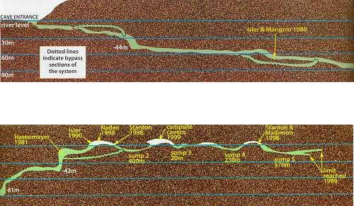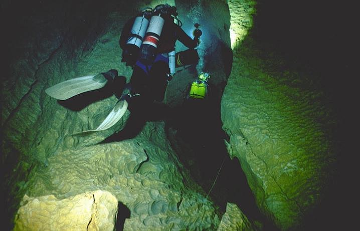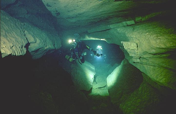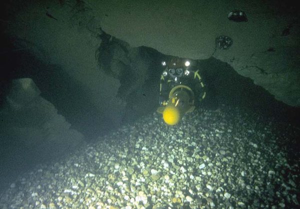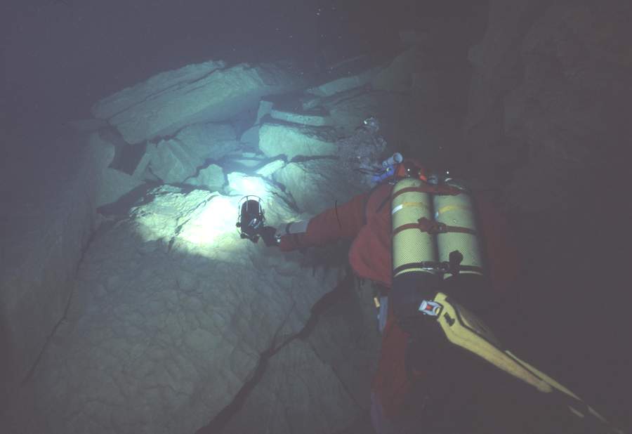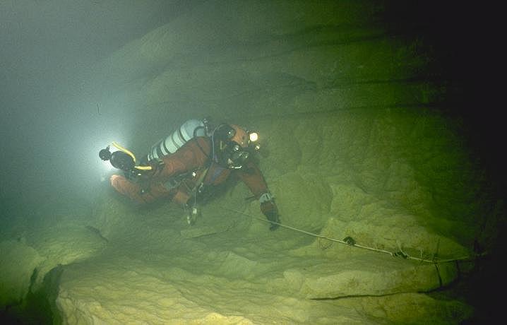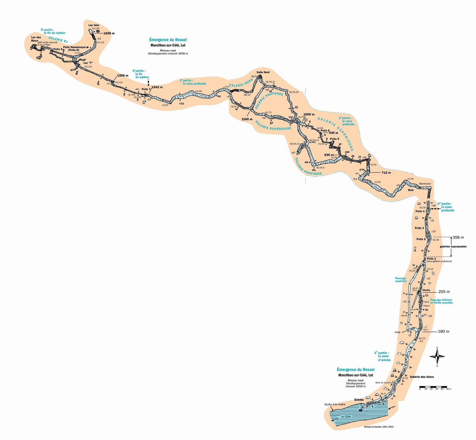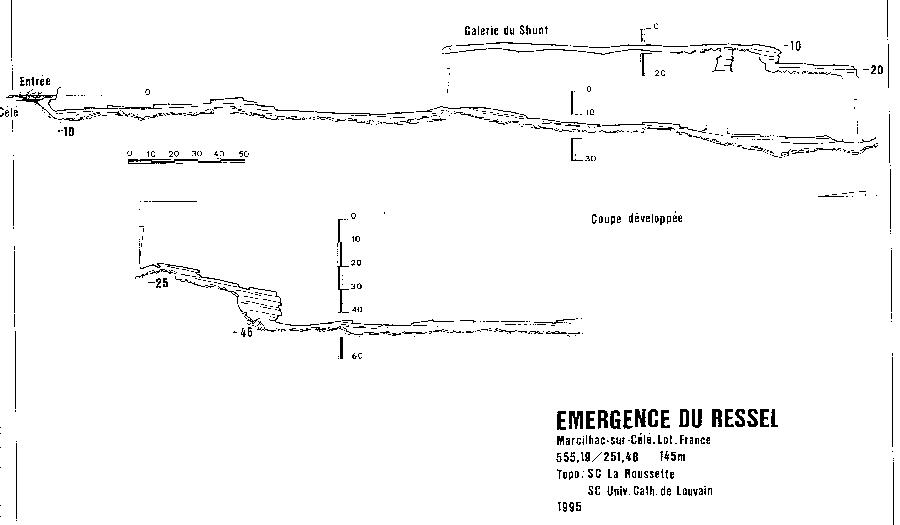 Situation A partir du village de Cabrerets, prendre la D41 en direction de Figeac. Traverser Marcilhac et continuer environ 1 km jusqu'au départ d'une longue ligne droite où la route longe de très près le Célé. Il y a un tout petit accotement d'où partent, de chaque coté , deux sentiers qui descendent en pente raide jusqu'à la berge. Un panneau rappelle aux plongeurs qu'il faut laisser l'endroit propre et que les toilettes se trouvent au village. C'est là qu'il faut s'équiper. L'entrée de la résurgence se trouve dans la rivière, à environ 60m en amont. Historique Assez peu connue, cette source semble avoir été explorée pour le première fois par les plongeurs du Groupe Spéléo AUVERGNAT (DEBRAS et MARTIN) en 1968, sur 150 m. En 1973, le C.R.S.A. d'ANCOULEME atteint cette même côte. En Août 1975, 3.L. CAMUS reconnaît la cavité sur 300 m, jusqu'à 30 m, et s'arrête au sommet du puits (la longueur annoncée 440m, a été ramenée à 300 ).Au mois d'Août 1977, 3.L. FANTOLI et C. TOULOUMDOIAN atteignent la côte 45 m à 350 m de l'entrée. Description A 3 m de profondeur, les flots limoneux du Célé font place aux eaux limpides de la source. Un large talus de gravier pénètre sous terre, par un porche de bonne dimension (h=l,5 m, 1= 2,5 m), et descend jusqu'à 10 m. A 120 m de l'entrée, une bifurcation donne naissance à deux galeries qui se rejoindront à 270 m, au niveau du puits. La galerie de gauche a une profondeur moyenne est de 10 à l2 m et ses dimensions sont plus petites (h = 1 à 1,5 m largeur 2 à 3 m) sa découverte et son exploration ont été réalisées par D. Andres, au cours du rééquipement en Fil d'Ariane de la source. Sur toute sa longueur le RESSEL possède sur ses parois d'innombrables cupules d'érosion. Sa particularité réside dans les strates éboulées, qui semblent découpées au couteau, et dans son creusement "en joint de strate". En général il se dirige vers le Nord-Est. La jonction des 2 galeries mène à un large puits qui descend par palier à -30m, puis -45m où une pente emmène jusqu'à -55m dans une vaste galerie. Une courte section mène à un amas de roche, puis à 120m de galerie sèche qui débouchent sur une sorte de canal. Une galerie latérale mène à un siphon aval. Le canal se termine sur le siphon n°2 de 400m de long, max -7m. On sort de ce siphon dans une cavité chaotique de 70m de long qui se poursuit sur un nouveau canal de 70m et bute sur un nouveau siphon. Le siphon n°3 fait 15m de long et enchaine sur une rivière de 350m de long jusqu'au siphon n°4. Au delà du 1er siphon On surfacing at lac T, turning right (south) submerges rapidly into S2 (max depth about 12m). After about 200m a junction is reached. Turning right surfaces in a canal that leads to the Salle des blocks. Turning left (North West) following the main line upstream leads into a larger tunnel "The Metro", the passage surfaces after about 100m where the water flows over large blocks. A 10M long channel has now been dug through these to allow crawling progress without de kitting. This air space was not counted by the original explorers, so Sump 2 ends after a further shallow dive of about 80m at a boulder slope leading up into the bivouac chamber. This chamber is about 50m long and 10m high. The ground here is broken and sharp, care is needed when walking in drysuits. The air in this chamber can be bad - high Co2 and low O2, it seems to be worst at the water level on the S2 side, improving as the rocks are The lake on the far side of the chamber provides a spacious area to gear up. 50 meters of canal is passed, before encountering S3. This is very short (5m) and can be missed if scootering mid water. a further 300 - 400 meters of canal (the lac long) leads to Sump4, which is 240m long and shallow. This finishes at another boulder pile in a small sump pool. Turning right (upstream / North) after 300m a maximum depth of 18m is reached before a boulder slope can be followed to surface. At the base of the slope, low and on the left, 50m of ongoing smaller passage in a NW direction leads to the terminal upstream boulder choke found by Rick Stanton and Jason Mallinson. Back at the 1000m T junction, turning left (downstream / South west) the large fossil passage continues in a South Westerly direction for about 900m, where it is possible to surface in an off route air bell. This ongoing passage is generally large with a
