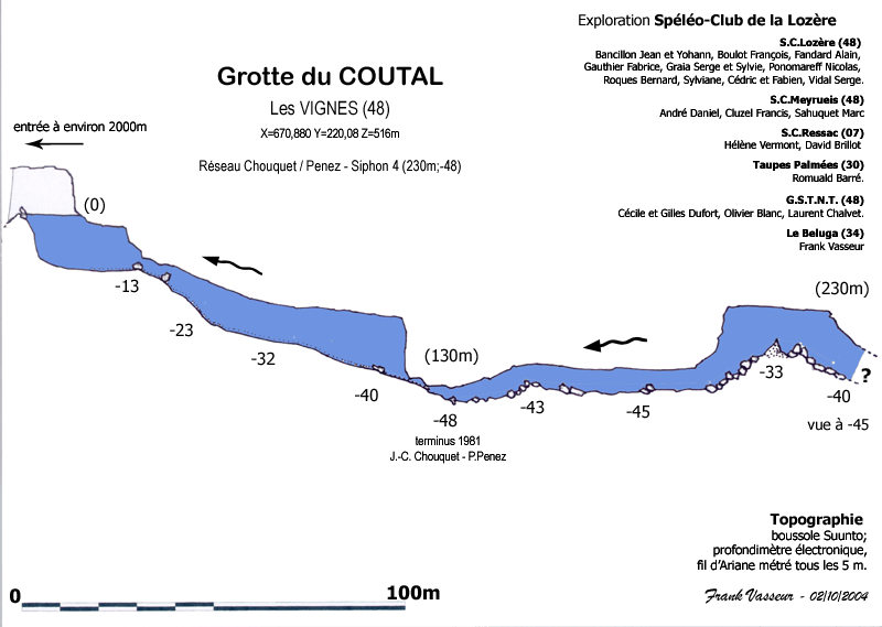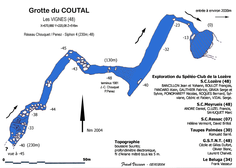 plongent le siphon de la Pissette sur 80m. Le 2/10/2004, Le S.C.Lozère organise, avec le soutien du S.C.Meyrueis, du T.N.T. et du R.E.S.S.A.C. une nouvelle plongée (Romuald Barré, Frank Vasseur) qui révèle 105m de puissant conduit noyé, digne des plus belles résurgences des Grands Causses. Le siphon remonte à -33 puis replonge à -40 (vue à -45) à 233m du départ. |