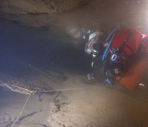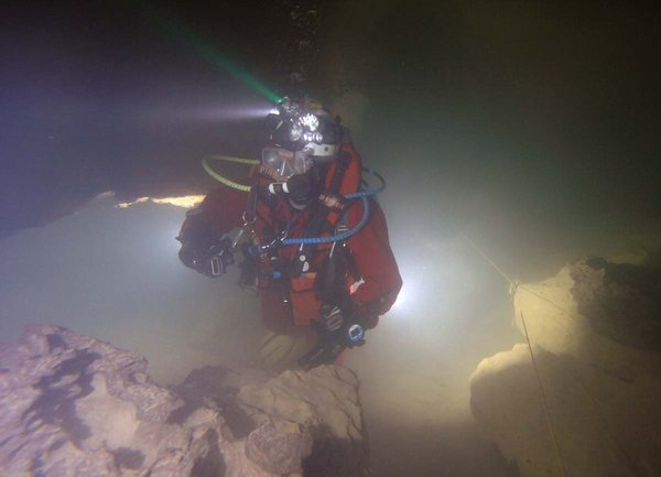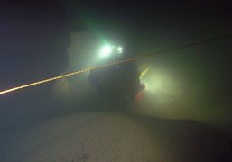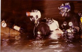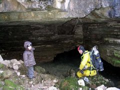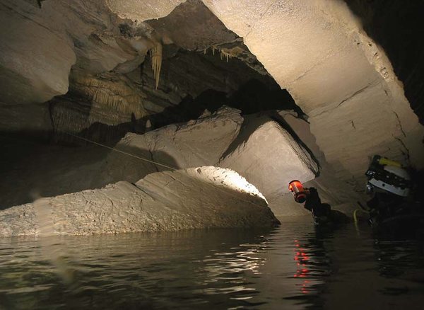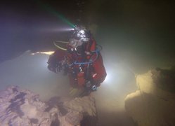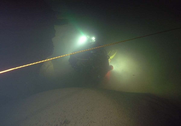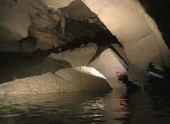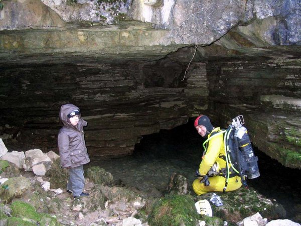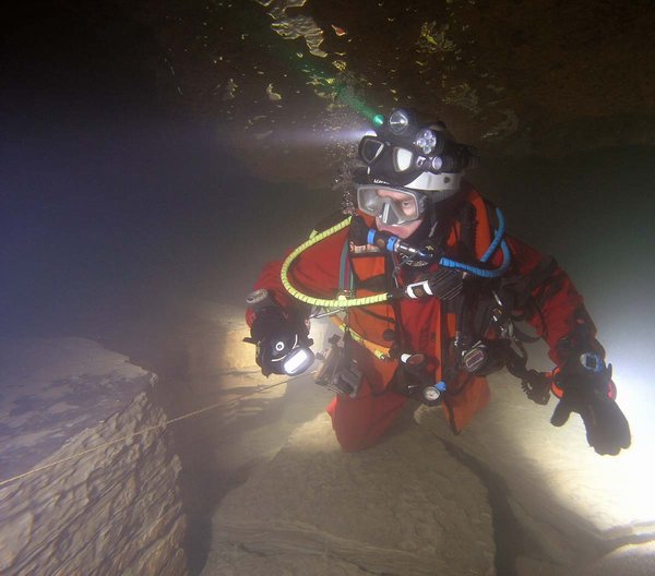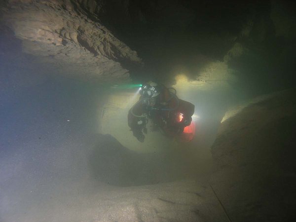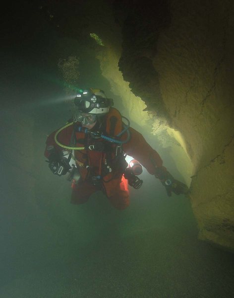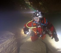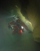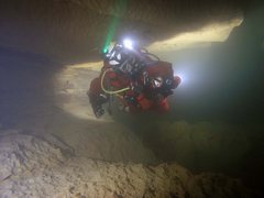 Siphon amont (165m ;-15), arrêt à –5 dans un laminoir étroit.