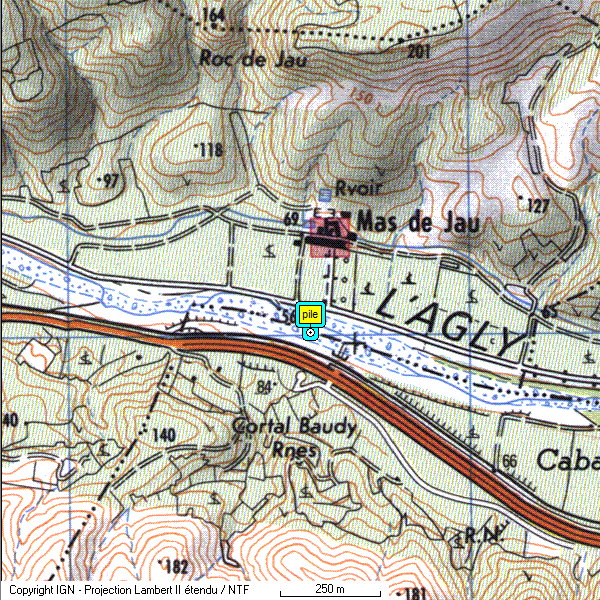 Commune d'Estagel Lambert III : x= 632,914 km y= 3053,011 km Z= 60 m |