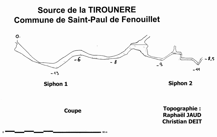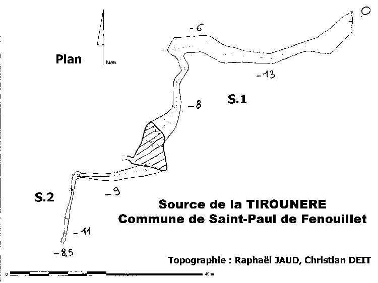 En septembre 1985, Denis Moulin franchit en décapelé l'étroiture terminale du S.2. Il progresse d'une vingtaine de mètres dans une galerie d'1,2m de diamètre parcourue par un violent courant malgré l'étiage exceptionnel. Arrêt sur étroiture à -2 sous un éboulis avec chute d'argile.