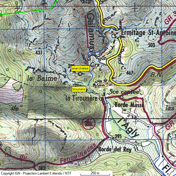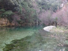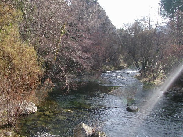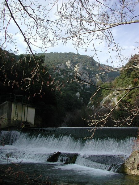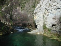 Résurgence en fond de rivière en rive gauche de l'Agly, au débouché aval des gorges de Galamus.
