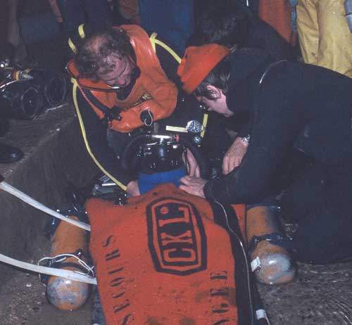 A la fin des années 70, l’équipe de la commission plongée de la Fédération Française de Spéléologie, en collaboration avec le Spéléo-Secours Français, s’est penchée sur les problèmes d’évacuation d’un poly-traumatisé post-siphon. Des essais avaient été réalisés dès 1977 dans le Jura (http://www.juraspeleo.com/cdsinfo/archives/info_176.htm). Les Rhône-alpins Daniel Andres et Jean-Luc Thevenin, premiers instigateurs d’un projet de sac étanche monté sur une civière, avaient pris contact avec l’équipe des Plongeurs Spéléo de Paris. |