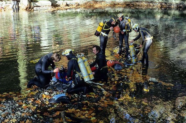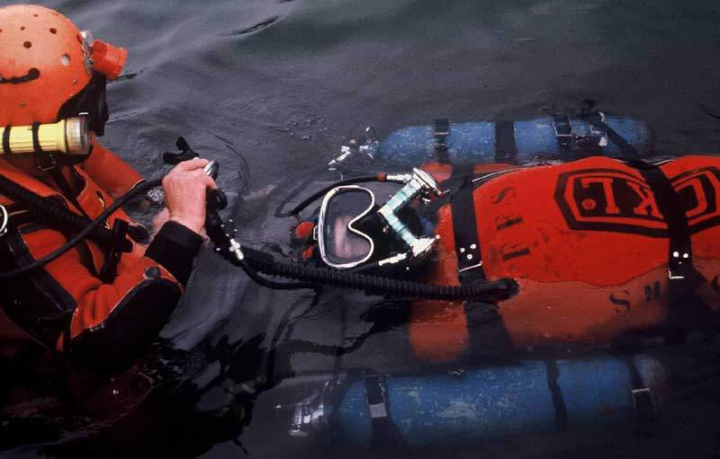 Cette équipe soudée de passionnés comptait trois plongeurs expérimentés (15 à 17 ans de pratique, dont un moniteur national), et ils enseignaient tous la plongée depuis une dizaine d’années. Ils disposaient d’une solide formation en mécanique et électro-mécanique (on retiendra la fabrication de side-cars, avec trois titres de champions de France) et étaient complémentaires des autres plongeurs, qui maîtrisaient la spéléologie. A la fin des années 70, ils se retrouvent en charge du développement d’un sac étanche monté sur une civière, pour répondre aux spécificités d’un éventuel sauvetage d’un accidenté post-siphon. |