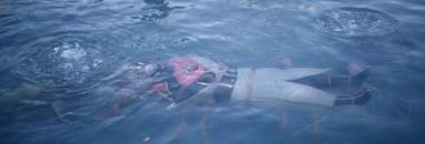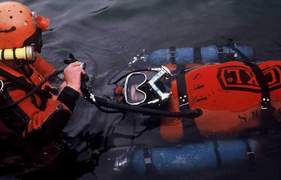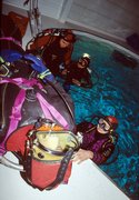 Le transport de la civière fut également revu. On avait constaté de gros problèmes avec les servants avants (les deux plongeurs qui dirigent le brancard sur l’avant), en combinaison humide et sans système d’équilibrage. L’équilibrage de l’attelage était assuré avec le sac étanche (dans lequel est placé le blessé), avec l’inconvénient de propulser le brancard au plafond dès lors qu’un plongeur lâchait la civière pour gérer son matériel ou sa plongée. |