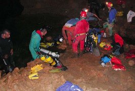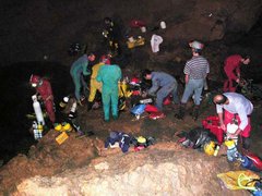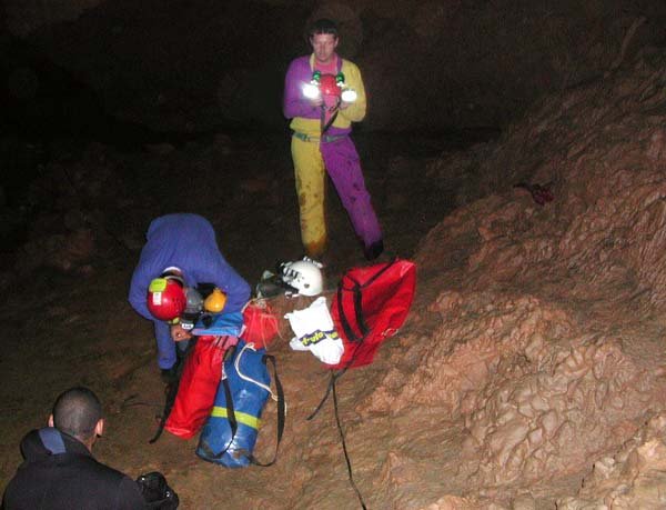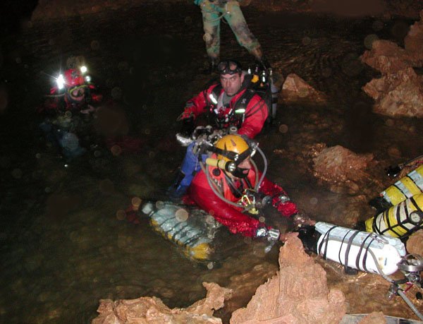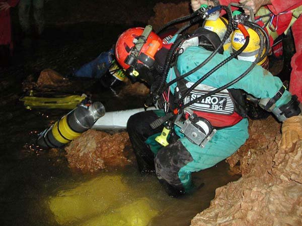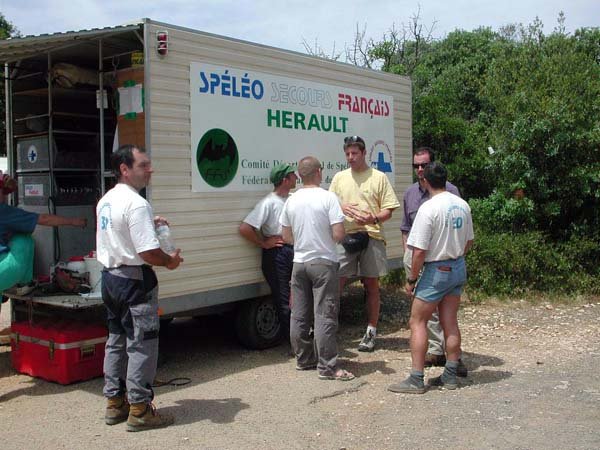 Mercredi 6 juin 2001-Situation à 09 H 00 L'équipe de plongeurs spéléologues et leurs accompagnateurs sont entrés dans la grotte à 7 H 00. Ils s'immergeront dans le 1er siphon vers 10 H 30 et ils auront environ 2 H de progression pour arriver au bord du siphon 6. L'équipe est prête à répondre à tous les cas de figures qui se présenteront. Sont prêts à intervenir :