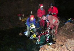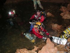 Mercredi 6 juin 2001-Situation à 15 H 50 Le plongeur vient d'être retrouvé vivant dans une poche d'air. Patrick Mugnier a été retrouvé vivant. Un médecin spéléo-plongeur va se rendre vers lui pour médicaliser et préparer la sortie. Mercredi 6 juin 2001-Situation à 17 H 50 Le spéléologue disparu a été retrouvé vivant à fleur d'eau sur un rocher. Il est conscient mais a du mal à respirer. Mercredi 6 juin 2001-Situation à 20 H 00 Au vu de la situation critique, l'équipe de plongeurs-spéléologues, en relation avec les Conseillers Techniques en surface, ont décidé, toutes considérations de sécurité et de santé requises, de faire franchir à Patrick Mugnier le siphon 6. Il est actuellement installé dans un point chaud entre le siphon 5 et le siphon 6, pour attendre l'arrivée du médecin. Dès que Bernard Gauche, Médecin spéléo-plongeur du SSF qui actuellement progresse vers lui, aura donné un avis favorable tout sera mis en oeuvre pour assurer son évacuation. Jeudi 7 juin 2001-Situation à 07 H 00 Bernard Gauche spéléo-plongeur du SSF, médecin (spécialisé hyperbare) est arrivé à 00 H 30 au point chaud où se situe Patrick Mugnier. L'état de ce dernier s'améliore d'heure en heure. Il marche, se réhydrate et récupère sa température vers la normale. Lorsque Frank Vasseur (spéléo-plongeur du SSF) l'a découvert, Patrick Mugnier était allongé et avait des difficultés respiratoires, la poche d'air était saturée en CO2 dégagé par le plongeur. Après discussion, il s'est avéré impératif pour ces deux plongeurs de ressortir entre le siphon 6 et le siphon 5. Le point le plus bas à franchir étant de - 20 mètres. Une fois sortie du siphon 6, ils se retrouvent au point chaud prévu à cet effet. Bernard Gauche l'ausculte actuellement et fera dans les heures à venir un bilan médical. Suite à ce bilan, le médecin pourra définir les conditions et l'heure de départ de l'évacuation. Suffisamment de plongeurs-spéléologues (30) sont sur place ainsi que de spéléologues (20), afin d'organiser cette évacuation avec la sécurité requise pour tous. Jeudi 7 juin 2001-Situation à 17 H 50 17h50 Bilan de santé par le médecin dans le VSAB : Excellent état physique et physiologique, Patrick Mugnier a subi dimanche un accident de décompression articulaire et il est actuellement sous oxygène pur. Il va être transféré par hélicoptère SAMU 34 vers la clinique St-Pierre à Perpignan (caisson hyperbare). Jeudi 7 juin 2001-18 H 00 Fédération Française de Spéléologie Communiqué à l'AFP Le bureau de la Fédération Française de Spéléologie (FFS) apprend avec plaisir et soulagement l'heureuse issue du sauvetage de Patrick Mugnier dans le gouffre de Fontanilles à Puéchabon (Hérault). Nous exprimons nos remerciements à tous les sauveteurs et plongeurs du Spéléo-Secours Français, commission de la FFS, ainsi qu'à tous les autres participants à cette opération de secours, bénévoles et corps constitués, qui ont contribué avec efficacité et dévouement à ce résultat. Patrick Mugnier, qui fait partie des meilleurs plongeurs souterrains du moment, compte à son actif d'importantes découvertes et explorations et contribue au développement des techniques de plongée profonde en spéléologie. Pour autant, la Fédération Française de Spéléologie ne peut cautionner le fait qu'une équipe se soit engagée dans cette exploration en ignorant la réglementation locale. Lorsque les circonstances le justifient, la Fédération Française de Spéléologie contribue en partenariat avec les collectivités ou les propriétaires privés à mettre en place des procédures de limitation ou de contrôle d'accès. En dehors de ces cas particuliers, la FFS souhaite réaffirmer son attachement à un libre accès aux sites de pratique et s'opposer aux mesures d'interdictions injustifiées. La Fédération Française de Spéléologie rappelle qu'elle intime à ses membres de respecter scrupuleusement les réglementations en vigueur. Sauvetage aux Fontanilles à quatre mains Article goupillé à partir de deux publications : « Secours aux Fontanilles » par Jean-Pierre Baudu (CDS 42 - Commission plongée souterraine) Photographies : Robert BOURRIER (Spéléo-Secours de l'Hérault). Jean-Pierre : Nous sommes le lundi 3 juin 2001, je reçois un message sur mon portable, c'est Fabien Darne. La nouvelle tombe : un plongeur n'est pas ressorti de la grotte des Fontanilles. Depuis 2 ans, Frank Vasseur a repris les explorations dans cette cavité. Son but est de poursuivre l'exploration du S6, au-delà de son précédent terminus à –77m. Il met en route une grosse organisation. Connaissant bien Frank, ce qui prime c'est la sécurité à toutes les étapes du processus. Beaucoup de copains sont là pour lui donner un coup de main. c 'est l'occasion pour beaucoup de découvrir cette superbe cavité dont l'accès est réglementé. Les relations de Frank avec les pouvoirs publics, les chasseurs et les protecteurs de la nature, l'ont amené sur un terrain d'entente collectif. L'exploration se fera en plusieurs étapes. En février et mars 2000, nous préparons les bivouacs post siphon et nous acheminons des échelles en alu jusqu'au S6 (1100m) pour le franchissement d'escalades délicates avec des bouteilles de plongée. Je participe à deux plongées. La deuxième plongée, nous permet Frank, Medhi et moi de rejoindre le S6. Rares sont les personnes qui ont nagé dans ce magnifique lac. Quelques mois plus tard, Frank m'appelle pour me demander si je veux être le plongeur qui l'accompagnera au S6 et qui passera la nuit au bivouac, lors de la pointe. Pour moi, c'est un honneur. Bien sûr, j'accepte et me fais un plaisir de préparer mon duvet conditionné dans un sac étanche pour passer les différents verrous liquides. Seulement, le début de l'année 2001 commence très mal, tempêtes, pluies, inondations… Le moral de Frank est au plus bas. Nous avion