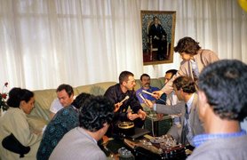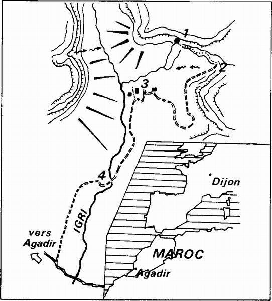 Un repas frugal, composé d'un tajine de mouton et de pain, nous est servi dans une habitation typique de la contrée. Assis en tailleur, sur des tapis, la situation est examinée en présence de toutes les équipes de secours. Des priorités sont données. Dans un premier temps, un nouvel équipement de la cavité s'impose, l'élaboration d'une main courante nous facilitera la progression dans le courant.