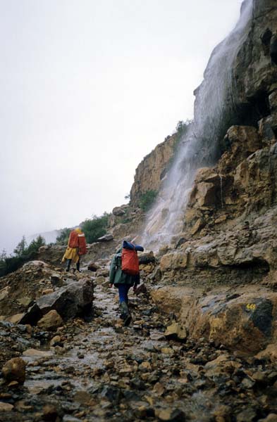 Et heureusement que la nuit nous cache les précipices! Après avoir effectué quatre mille kilomètres en moins de trois heures, il faudra quatre heures pour vaincre ce tronçon de piste. Selon les renseignements, une logistique "d'enfer" nous attend au pied de la grotte où nous pourrons nous reposer et nous alimenter. Malheureusement, en guise d'hôtel trois étoiles, deux tentes de trois mètres carrés, percées de toutes part, recouvrent une dizaine de lits de camps qui ont bien du mal à se tenir hors de l'eau Quant à la nourriture, les équipes de secours sur place n'en ayant pas pour elles-mêmes, seraient bien en mal de nous en fournir. Une décision d'urgence s'impose: Une première équipe de quatre hommes partira en reconnaissance, le reste du groupe se replie aux premières habitations, pour établir un camp de base.