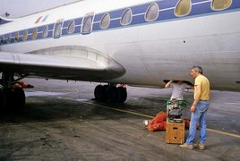 Le matériel s'amoncelle au milieu de la cour au fur et à mesure de l'arrivée de l'équipe. Trente mètres cubes pour un poids de trois tonnes nous laissent entrevoir quelques problèmes de transport !.. Après un retard d'ordre technique, un avion de type "Caravelle" se pose sur l'aérodrome de Dijon-Longvic. Le chargement s'effectue dans la soute à bagage d'un volume de 6 m3, et le reste trouve sa place, ficelé entre les sièges des passagers. Ce n'est que vers 21 h 30 que nous quittons le sol dijonnais pour Agadir.