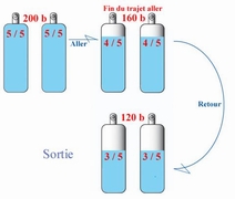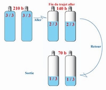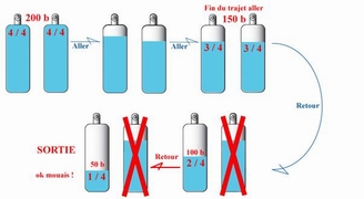 Lors d'un problème survenant au point le plus éloigné de l'entrée (c'est à dire lors du demi-tour), le plongeur finit la plongée sur une bouteille et dispose de 2/5 de gaz pour rentrer.