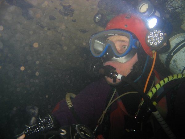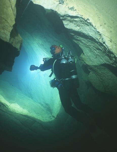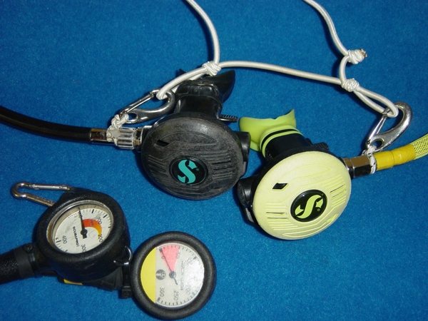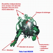 La profusion et la lourdeur, relatives par rapport à la configuration de base du plongeur sous-marin, de l'équipement du plongeur souterrain choquent souvent le néophyte. L'équipement classique Composé de matériel « standard » de plongée, il est amélioré, adapté, configuré pour la plongée souterraine. Le masque Un second masque (de secours) pourra s'avérer utile. Il peut être porté sur le biceps, sur la nuque, sur le casque, dans une pochette de secours ou ailleurs. L'important étant de le trouver puis d'en disposer rapidement en cas de nécessité. Les palmes Pour s'affranchir des problèmes de boucles qui cassent ou se dérèglent, ainsi que des ruptures de sangles, il est judicieux de remplacer le tout par du sandow ou un ressort métallique fixé sur des boucles métalliques ou des anneaux percés. Pour plus de détails, voir article sur les palmes, sur ce site La Combinaison La durée de vie de la combinaison humide sera considérablement accrue si on lui associe une sur-combinaison toilée (type combinaison de spéléologie). la combinaison étancheTout est possible en la matière : toile, néoprène ou néoprène pré-comprimé, fermetures « tour de cou », « épaules-épaules » ou « épaule-hanche » , manchons et collerettes en latex ou néoprène. Il est impossible de préconiser un type de vêtement « idéal », dans la mesure où la température des siphons français varie de 4 à 18° C selon les régions et les périodes de l'année (fonte des neiges) et qu'il existe autant de possibilités diverses d'utilisation que de cavités. On retiendra tout de même que les vêtements en toile sont plus appropriés à la progression entre les siphons (plus souples), qu'il est préférable de limiter la masse de plomb à transporter pour compenser la flottabilité du vêtement, que l'isolation dépend presque autant de la qualité des sous-vêtements que du vêtement en lui-même. Un « gadget » a fait le bonheur de plus d'un plongeur souterrain : la purge-pipi, qui permet de se soulager à l'extérieur du vêtement. Elle autorise une hydratation adéquate lors des plongées. Elle demeure à ce jour réservée aux hommes, bien que des astuces aient été développées pour ces dames. Pour en savoir plus dans ce domaine : la purge pipi Les DétendeursLes modèles avec premier étage à membrane supportent généralement mieux la plongée en eaux chargées que ceux à piston (pas de joint qui travaille dans le sable ou l'argile). Il est quasiment acquis qu'on les accroche autour du cou. Une cordelette, un anneau de tuyau chirurgical ou de sandow en guise de « tour de cou » est fort utile pour accrocher les détendeurs à portée de main permanente, loin du sol (sable, argile). Cette disposition présente plusieurs avantages. Les deuxièmes étages ne traînent pas dans les sédiments, ni ne s'accrochent aux parois. Ils sont surtout disponibles immédiatement, sans nécessiter de recherche en cas de besoin. Certains marquent (ruban adhésif coloré) de la même couleur le manomètre et l'inflateur auxquels ils correspondent, à chaque extrémité du flexible (utile pour indiquer au collègue quel robinet fermer en cas de débit constant sur un détendeur) ou retrouver « ses petits » sans avoir à faire du tri en cas de problème. Les ManomètresChaque bouteille en est impérativement équipée. Le manomètre est marqué de la même couleur que le détendeur et l'inflateur auxquels il correspond. Ils doivent « tomber sous la main » (accessible aisément et sans avoir à chercher) car ils sont régulièrement consultés, demeurer près du corps pour ne pas pendouiller et s'accrocher partout. D'aucuns les accrochent ensemble sur le devant du corps (abdomen), d'autres au poignet avec des dragonnes, certains les solidarisent du détendeur, on peut aussi les faire « sortir » du même côté ou de part et d'autres du plongeur. L'éventail de possibilités est vaste et la configuration « universelle » reste à inventer. Les flexibles la gaine plastique torsadée (de type protection de câbles électrique) s'avère robuste et efficace, mais présente l'inconvénient d'incruster le sable dans le flexible. La raideur du matériau a tendance à rigidifier le tout au détriment de la souplesse du port du second étage en bouche. Le filet souple, distribué dans les échoppes de plongée, est plus fragile, mais plus souple et se rince aisément. Le matériel spécifique Le casque protéger des chocs Attention, la mousse qui rembourre certains casques s'écrase avec la pression et modifie le réglage de la taille en profondeur (bascule du casque sur le masque, en arrière ou sur un côté). Les rembourrages en polystyrène se compriment sous l'effet de la pression, et ne retrouvent plus leur volume initial après une incursion en profondeur. La jugulaire doit être aisément manipulable (ouverture / fermeture) – certains l'ont remplacée par un élastique robuste -, le casque ne doit pas piéger l'air (ouvertures dans la coque). Eviter les modèles trop proéminents. Certains se contentent d'une simple coque de casque d'eau-vive. L'éclairage Pour l'éclairage puissant, favoriser les modèles avec boyon : un pack de batteries porté à la ceinture. Il remplace avantageusement une partie du lestage. On trouve sur le marché plusieurs types d'ampoules, l'éternelle halogène, le HID (grande autonomie, belle luminosité mais fragile), la LED (très grande autonomie, pratiquement incassable).Là aussi comme la combinaison, à chacun de faire ses choix. Généralement, on fonctionne à l'économie et on allume rarement plus de deux lampes simultanément (mais au moins deux pour éviter de se retrouver dans le noir en cas de panne). Favoriser les interrupteurs manipulables d'une seule main et facilement accessibles (parce qu'on en a généralement une sur le fil d'Ariane). Dans certaines conditions (balade, grands volumes, propulseur) le port de la tête de phare sur le do