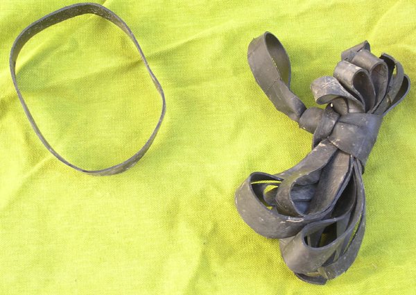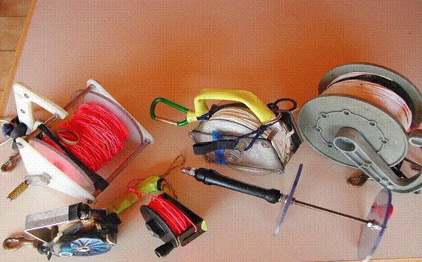 Nos collègues d'Outre-atlantique condamnent l'usage des mousquetons de type « montagne » car ils peuvent s'ouvrir tout seuls et emprisonner des éléments (boucles, sangles diverses, fil d'Ariane…etc.) à l'insu du plongeur. Le dévidoir Il faut éviter de le remplir au maximum et de serrer les spires, afin qu'en cas de rembobinage le fil occupe le même volume dans le dévidoir. Dans l'eau le fil a tendance à « gonfler » et occuper un volume plus important que quand il est sec. C'est pourquoi, une astuce consiste à laisser tremper le fil dans l'eau quelques heures avant de l'enrouler sur le dévidoir. Un dévidoir trop plein est dangereux, des spires risquent de s'échapper, de le bloquer et de le rendre inutilisable. Au vu du panel de tâches à effectuer, il est convenu que plusieurs modèles puissent être mis en œuvre. On peut identifier trois types de dévidoir : Dévidoir de secours Dévidoir de progression Dévidoir de travail Deux « écoles » cohabitent : L'important étant de disposer en permanence d'un dévidoir muni de fil, capable de rembobiner, pour réaliser une recherche de fil perdu, équiper une galerie, rafistoler un fil en place, signaler sa position depuis une cloche où on aurait trouvé refuge… etc. Quelques anneaux de chambre à air, utiles tant au maniement du fil d'Ariane que pour divers rafistolages, sont indissociables des dévidoirs. Le fil On prend la précaution de le faire tremper 24 heures puis de le laisser sécher avant de le métrer et de remplir son dévidoir, pour éviter de fausser les distances (rétractation du fil d'environ 10% après le premier trempage) et pour occuper le même volume dans le dévidoir une fois en siphon. Une fois installé, sa durée de vie est très variable selon les cavités, les conditions (crues) et surtout la qualité de l'équipement réalisé. D'autres fils-guides tendent à se développer : câble ou cablette gainée pour un équipement fixe des conduits « turbulents », cordes de spéléologie. A l'usage certains fils se sont révélés dangereux, tel que l'acier de petit diamètre, quasi- invisible, ainsi que les fils flottants. Anneaux élastiques (ou « caouèches ») Pochette de secours
