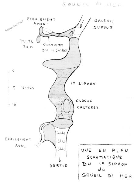 En moto avec Raoul. Les trois cartouches du 21 ont bien travaillé mais permettent de constater que le trou souffleur s'amenuise et n'est qu'une crevasse… Au siphon nous faisons des ligatures en fil de fer à nos perches et nous insinuons notre tige sous l'eau après avoir fixé à l'extrémité une lampe électrique allumée dans un bocal de verre étanche. Le procédé s'avère efficace et la lueur de la lampe se voit sous l'eau. Le niveau du lac a baissé de 3 cm depuis le 21, soit 48cm au-dessous du repère. Je me deshabille pour me revêtir de lainages, je me harnache du scaphandre, et, porteur d'un bocal contenant deux lampes électriques allumées, je m'enfonce sous le siphon en me guidant le long de la perche. Je ne suis pas assez lesté et éprouve des difficultés pour avancer et évoluer. J'arrive toutefois jusqu'à l'extrémité de la perche où la lampe du bocal éclaire toujours ; Le froid est intolérable, la visibilité assez limitée ; j'entrevois la voûte immergée, des parois accidentées. Pour aller de l'avant, je tire la perche pour la faire avancer vers l'inconnu, mais mon défaut de lest me fait trop léger et au lieu de faire progresser la perche, c'est moi qui recule… Les efforts m'essoufflent et m'obligent à dépenser beaucoup d'air. Devant l'insuccès de ma manœuvre, je me détermine à faire demi-tour, toujours en suivant la perche et la cordelle que Raoul tient sur le rivage. Je n'ai passé sous l'eau qu'une minute environ et progressé de 8 à 10 mètres. Raoul fait à son tour une plongée, mais négligeant le guide de la perche, il nage sous l'eau vers la droite, monte en surface et débouche dans une poche d'air emprisonnée sous une voûte en cloche. Il revient sans avoir entrevu de prolongement (tandis que pour ma part j'ai constaté que le champ était libre devant moi). En somme c'est une première expérience. La prochaine fois nous serons plus familiarisés et avancerons plus loin.