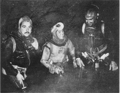 La voûte plonge dans une nappe d'eau turquoise, ce siphon est beau et engageant, le couloir immergé a cinq mètres de large et la profondeur de l'eau est bien d'autant. Il est beaucoup trop tard pour que nous retournions chercher les bouteilles pour pousser une reconnaissance au-delà. Avec un galet, j'inscris nos noms sur l'argile qui recouvre les parois. Nous avons mis une heure pour venir jusqu'ici. Ce second "verrou" fera l'objet d'une prochaine exploration; il faudrait une équipe de plongeurs plus importante car les plongeurs qui passeront ce deuxième obstacle ne doivent pas avoir à transporter leurs bouteilles jusqu'ici. Maurel sort un cendrier-réclame que nous avons chipé, nous l'avouons, au restaurant d'Arbas, et le place dans une niche. Témoin de civilisation et de notre passage, nous espérons le retrouver l'an prochain lors d'une prochaine incursion. Nous tournons le dos au siphon J.Y.G., Jacques-YvesGuy; nous avons hâte de porter la nouvelle. Avec la corde de 25 mètres, nous chaînons le parcours. Parvenu à nos scaphandres, nous avons parcouru 1386 mètres, "beau résultat". |
