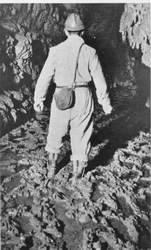 siphon. En période de crue, le trop-plein sort par cette galerie. Maurel ouvre la marche avec la lampe à acétylène, je fais serre-file, l'éclairage de Parent ne fonctionne pas. Nos vêtements nous tiennent chaud, c'est allégrement que nous barbotons dans l'eau glacée. Nous avons fait environ trois cents mètres, l'eau
