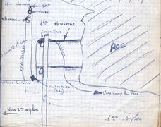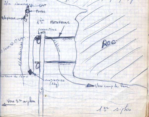 Le croquis de la page suivante, une installation qui nous permettait d'atteindre notre téléphone de la 1 ère plate-forme. Cette une installation que nous avions imaginé et réalisé. C'est un peu archaïque, mais très efficace. Une poulie fixée sur la roche en hauteur, un contre-poids pour tenir le combiné, lui aussi en hauteur et une corde de traction pour faire descendre le combiné téléphonique à soit. Cette petite invention avait deux avantages. D'une part, en cas de crues, de montée des eaux, le combiné ne serait pas noyé, étant hors de portée de l'eau. Il faut savoir qu'en période de crue, nous avions près de 20 centimètres d'eau sur cette plate-forme ! L'autre avantage, quand on arrivait ici, il nous suffisait de tirer sur la corde et de faire descendre le combiné jusqu'à nous. Ça évitait à un plongeur de grimper sur la plate-forme pour communiquer avec l'équipe de soutien restée en arrière ! En relâchant la corde doucement, le contre poids, (2kg), ré entraînait le combiné vers le haut, à l'abris des montées des eaux ! Tout était parfait avec ce petit système très simple, mais tellement pratique !
