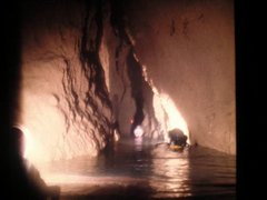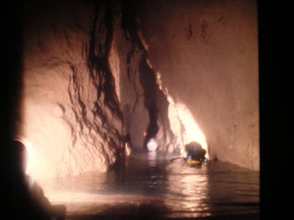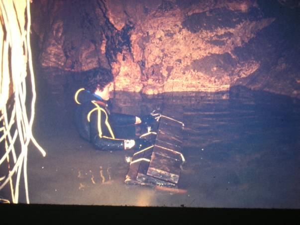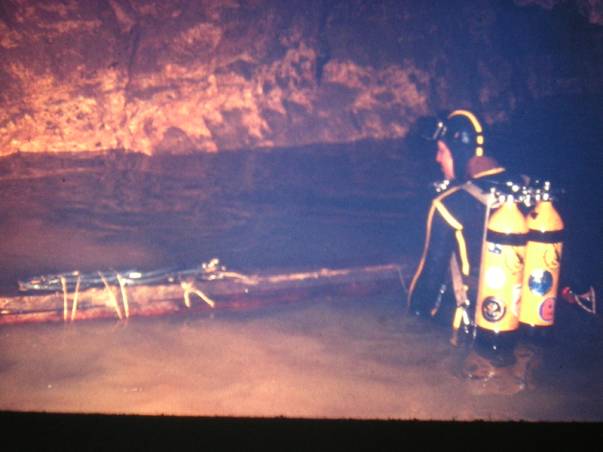 Ici, la première plate-forme, juste après avoir débouché du 1 er siphon. Nous sommes dans la salle en cloche. La plate-forme n'est pas terminée, nous agrandirons le plancher et en feront un autre, un peu plus bas, pour se tenir debout. Le petit bateau gonflable, que l'on aperçoit, nous servait à entreposer du matériel, tel que des outils, scaphandres de secours, etc… Sous les eaux de ce petit lac, un passage à 8 mètres et l'autre, à 19 mètres de profondeur, nous permettant d'entrer dans la diaclase du 2 ème siphon et ensuite, la rivière souterraine que l'on voit sur la photo précédente.