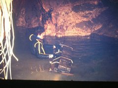 Je partais donc voir et je descendais dans le puit en solitaire. En commençant à m'engager dans le 2 ème siphon je ne trouvais pas Mickey qui aurait du être là ! Tout en pensant qu'il avait du s'engager un peu dans ce siphon, j'y allait et au final je l'ai franchi complètement, tout en pensant que mon air restant était bien pauvre ! Toujours pas de Mickey et encore moins d'Henri et de Pépé. Cette fois cela commençait à faire beaucoup de bizarreries ! Je me suis fait la rivière, en surface, pour rejoindre la nouvelle 2 ème plate-forme. Je commençais à en avoir marre, j'était crevé ! J'ai retrouvé Pépé, Henri et Mickey sur la plate-forme. Mickey avait transgressé la règle qui consiste à ne pas plonger seul (m'ayant obligé à le faire moi-même). Enfin j'arrivais près d'eux :