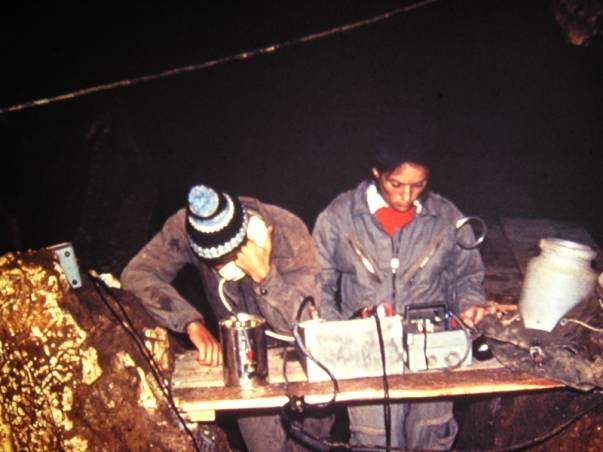 Cette préparation nous a obligé à une expédition de reconnaissance approfondie préliminaire. Nous sommes en décembre 1972. Nous étions six : Daniel, Mickey, Bob, « Pépé » Yves, Henri P. et moi. Nous passons deux par deux jusqu'à la 1 ère plate-forme. But de cette expédition, tirer un câble téléphone de cette première plate-forme, passer le 2 ème siphon et fixer ce câble avec un combiné, assez haut au dessus du niveau de la rivière souterraine. Nous nous y mettons à quatre, car nous n'avons pas pieds ici. Les uns tiennent les outils et les passent aux deux qui s'occupent de fixer un « spit » dans la roche. Henri P. s'occupe de faire le trou dans la roche, tandis que je le soutiens comme je peux pour qu'il puisse travailler le plus haut possible. Pépé et Daniel nous assistent en nous passant le matériel. IL y à pas mal de débit dans THAÏS à cette époque de l'année, donc pas mal de courant dans cette rivière. Mais c'est supportable. Ce travail étant fait, nous communiquons avec Bob et Mickey, restés en attente sur la 1 ère plate-forme. Ce que nous venons de faire est un travail provisoire, pour l'instant, et la liaison téléphone fonctionne bien. Retour sur la plate-forme pour tous. Un peu crevant tout ça !! Un peu de repos et nous repartons Henri et moi, avec notre système « topofil ». C'est surtout la tablette pour écrire qui nous intéresse, pour prendre des notes, ici tout est déjà topographié ! Nous partons aussi avec un cinq mètres à ruban. Daniel et Mickey font retour à travers le 1 er siphon pour rejoindre l'équipe de soutient dans la grotte. Sur la plate-forme restent Bob et Pépé. Henri et moi repassons, à nouveau le 2 ème siphon et parcourons la rivière jusqu'au bout, là ou nous avions fixé le combiné téléphonique. Le but de la manœuvre : prendre note, le plus exactement possible, des dimensions de la rivière, là où nous avions repéré des endroits, dans la roche, où nous pourrions faire tenir notre 2 ème plate-forme. De petites cavités de part et d'autre des parois. Ceci étant fait, c'est le retour pour tout le monde et notre rentrée sur Lyon !