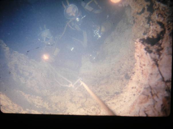 plate-forme !! On avait fini Henri et moi et les derniers outils on été fourrés dans un sac. On pouvait partir mais tout allait très mal encore ! D'abord, j'étais sur la plate-forme, j'avais enlevé mes palmes du mousqueton de ma ceinture de plomb. Je n'ai pas fait attention, cela faisait plus de quatre heures que nous étions ici, un peu fatigué quand même, mais pas d'excuse !! Une palme m'a échappée et le courant de la grotte de THAÏS l'a emporté. Mon retour serait un peu plus compliqué ! Mais pas grave ! Le plus grave était le reste !!