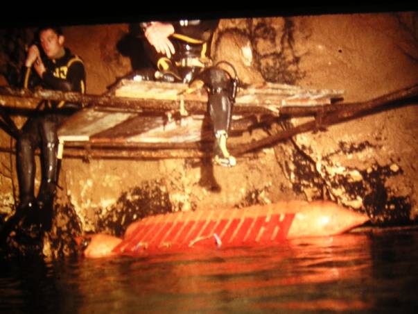 Oubliant momentanément la panne de ce combiné, on s'est mis au travail tous les quatre. On oeuvrait tous les quatre dans le fond de la rivière souterraine, en maniant clefs à griffes, clefs à molettes, pinces coupantes et marteaux que nous avions sortis de nos sacs. Rien n'était facile, on devait sangler nos sacs vides sur quelque chose de lourd pour qu'ils ne partent pas dans le courant. Nous travaillons sans relâche, avec pour seul bruit, celui de nos détendeurs et de nos bulles d'air et pour seule conversation, les signes que nous nous faisions ! Nous soulevions d'énormes nuages de sables et de glaises. Cela voilait notre vue quelques instants, mais le courant nettoyait rapidement notre environnement. Nous n'avons mis pas moins de 30 minutes pour démonter le premier paquet de tubes et de planches et bloquer ce qui risquait de partir avec le courant. Puis il a fallu entreprendre de poser le premier vérin entre les parois rocheuses, distantes, d'entre elles, de deux mètres. On était obligés de le poser au ras du niveau de l'eau et on s'est mis deux par deux, l'un éclairant l'autre. Je le rappelle, nous n'avions pas pied, qu'il y avait du courant et que nous avions pris le soin d'amener nos tuba pour respirer en surface, ce qui ne ce fait pas en siphon, en raison des risques d'accrochages dans les rochers.