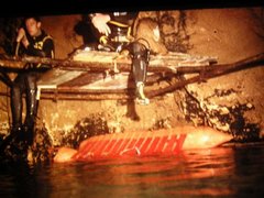 Mickey est parti pour repérer Henri et Pépé. Il faut se souvenir que Pépé avait son scaphandre principal complètement vide. Nous avons su, par la suite, que celui d'Henri ne valait guère mieux. Agrippés au tubes de la plate-forme, Daniel et moi attendions (on était pas monté sur la