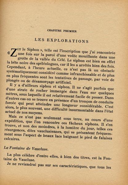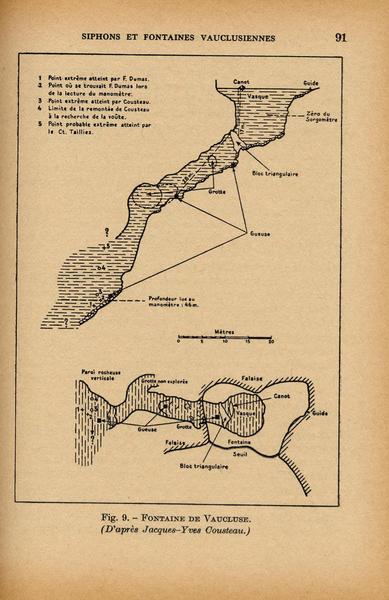 Pour ma part, la révélation des possibilités ouvertes par le scaphandre autonome Cousteau-Gagnan, fut à l'origine de l'exploration systématique des résurgences vauclusiennes du département du Lot. Les circonstances voulurent, en effet, que peu après avoir eu connaissance de l'expédition du commandant Cousteau, on me demandât de venir à Cahors pour tenter l'exploration de la Fontaine des Chartreux (la Divona Cadurcorum des Romains).