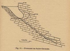 Au contraire, de l'autre côté du Lot, je trouvai au fond de la vasque nouvellement édifiée un orifice d'environ quatre à cinq décimètres carrés de section. Bien que ceci se passât en période de forte sécheresse, il sortait de cet ajutage un courant d'une telle violence qu'il projetait, loin en avant, du sable et des gravillons et que les poissons, qui fuyaient devant moi, ne pouvaient pénétrer dans cet abri.