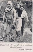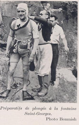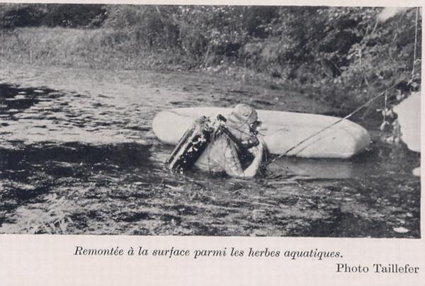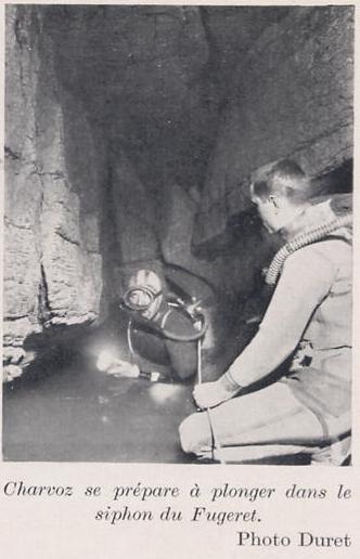 spéléologues connaissent bien, ni sur les nombreuses études publiées à son sujet. Je rappellerai seulement que deux tentatives d'exploration par plongée, avaient été faites avant la guerre. L'une, le 27 mars 1878, en présence de l'ingénieur Bouvier ; le scaphandrier Ottonelli atteignit une profondeur de vingt-trois mètre», l'autre, le 27 septembre 1938, devant M. de Joly ; le scaphandrier Negri descendit plus bas encore et prétendit atteindre le coude du siphon.