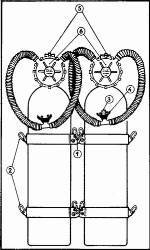 On peut les porter soit en mono, soit en bi-bouteille. Elles sont munies chacune d'un robinet. Il suffit de faire exécuter un raccord spécial pour y adapter le détendeur COUSTEAU.