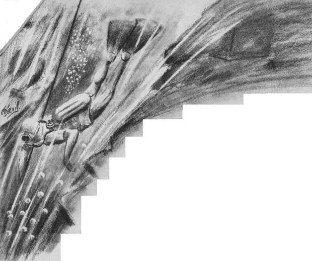 Je m'équipe et commence à descendre. Il faut faire vite : l'eau est à 8° et je suis en slip ! Le froid est si engourdissant que je n'en souffre plus, il n'en est que plus dangereux. D'ailleurs, la réserve d'air ne peut durer longtemps ; il n'est pas question ici, comme en Méditerranée, de ménager son, souffle ; pour lutter contre le froid, il faut, au contraire, brûler le plus possible d'oxygène. De toute façon, la suffocation de cette eau glacée sur la poitrine est telle qu'il est impossible de retenir un instant sa respiration.