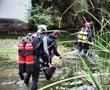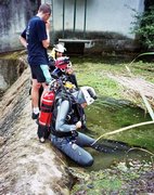 Après avoir remonté la rivière à la palme sur environ 50m, le moniteur me montre un fil attaché à une branche surplombant la berge et me dit " tu n'as plus qu'à le suivre.... " En regardant vers le fond, à travers une eau limpide comme de l'Evian, je vois disparaître cette petite ficelle entre de belles algues vertes camouflant la sombre entrée de la résurgence barrée par un tronc d'arbre mort. Après être entré dans le trou, il me vient une grosse montée d'adrénaline suivie d'une grosse angoisse lorsque je réalise que j'ai un plafond au-dessus de la tête, je me demande alors pourquoi je fais ça, pourquoi je suis ce fil d'Ariane qui me conduit je ne sais où et qui seul me permettrait de retrouver la sortie ? Je me rassure assez vite en pensant au matériel que j'ai sur le dos : 2 bouteilles indépendantes, 2 détendeurs, 2 manomètres. Si un système merde, il me reste toujours l'autre, pour me rassurer je m'imagine être un vrai sous-marin complètement autonome, quoiqu'il arrive.... Au fond du trou, 6m plus bas, je vois la galerie se rétrécir et partir à l'horizontal, c'est là que le fil m'emmène, la lumière du jour n'y sera bientôt plus qu'un souvenir. Passée la première étroiture, le faisceau des 2 lampes montées sur mon casque s'écrase toujours sur une paroi minerale quelle que soit la direction dans laquelle je les oriente.... Seule la contemplation du milieu me permet d'oublier, brièvement hélas, mon angoisse. Le halo bleuté du puissant phare HID du moniteur qui me suit projette mon ombre sur les parois découpées et me rappelle que je ne suis pas seul. Fausse idée car il m'avait mis en garde : " en plongée spéléo, même si on plonge à plusieurs, aucune assistance n'est possible, pas d'échange d'embout, rien, tu es 100% autonome, tu te débrouilles ! " Après une trentaine de mètres parcourus dans un boyau minéral sinueux, on atteint le point bas du siphon à -13m juste après une sérieuse étroiture. De là remonte une cheminée presque verticale. Ce premier mouvement dans le sens des bulles me rend instantanément euphorique car je m'imagine déjà percer la surface. Faux espoir, plus haut le boyau repart aussitôt à l'horizontale puis redescend. 40m plus loin, la galerie s'élargit et en regardant vers le haut, j'aperçois enfin le reflet de mes lampes sur une grande flaque argentée, enfin la surface, nous avons passé le siphon et pourrons bientôt sortir la tête de l'eau et communiquer !!!! Ce siphon est connu, il n'est pas dangereux d'y respirer l'air de la partie exondée, ce n'est pas toujours le cas dans les autres.... Nous n'avons parcouru que 70m en distance déployée et pourtant je me sens si loin du monde, heureusement la présence de gros tuyaux de captage dans la cloche traduit le fait que d'autres hommes sont même venus travailler dans cet endroit égaré, ca me rassure. On discute un peu avec le moniteur, nous faisons de la buée en parlant, il fait froid. Lui aurait envie de poursuivre dans le 2ème siphon mais ce n'est pas au programme, nous choisissons le sens de la sortie. Au retour, l'eau étant restée claire après notre passage, il m'autorise à lâcher le fil à condition de le " tenir du regard ". Je me sens enfin en confiance, je savoure et prends mon temps, c'est un régal pour les yeux : des failles immenses et étroites disparaissent dans les méandres du boyau et resteront pour toujours inexplorées.... Bien qu'il soit difficile de se repérer dans ce siphon, l'arrivée dans la cheminée m'indique la moitié du parcours, je m'y laisse tomber le plus lentement possible en laissant glisser mes mains le long de la paroi rugueuse. En bas, je prends mon temps pour passer l'étroiture, je vide mes poumons pour me rapprocher le plus possible du fond, je replie les bras sous le ventre et me laisse glisser lentement, sans respirer, en écoutant attentivement le moindre bruit que pourrait produire le contact de mes blocs et de mes détendeurs avec la roche. Une fois de l'autre coté, je me retourne et attends le passage du moniteur, vision fabuleuse : seul son faisceau est d'abord visible, il permet de distinguer nettement, à contre-jour, le profil dentelé de l'étroiture. Ensuite apparaissent lentement son casque, ses épaules puis son scaphandre tout entier. C'est une vision à couper le souffle, je me dis que j'ai de la chance de pouvoir admirer ça de mes propres yeux.... Bientôt j'aperçois au loin une douce lueur étonnament fixe, je comprends que la sortie est proche et je regrette déjà. Un bouillonnement sourd attire mon attention, ce sont les bulles de nos scaphandres qui roulent au plafond en se dilattant, je m'arrête un instant et contemble ébahi les rayons de soleil qui transpercent ce bleu unique et viennent éclairer les premiers rochers qui ne se trouvent plus maintenant qu'à quelques mètres devant moi, de nulle-part ré-apparaissent quelques poissons qui avaient disparu avec l'obscurité. En perçant enfin la surface, je ne sais pas quoi dire pour décrire ce que j'ai vu et ce que j'ai ressenti, je suis presque étourdi par tant d'espace et de lumière. Je lève les yeux et regarde le soleil, les nuages et je n'en reviens pas, nous ne sommes restés que 14min dans ce trou et pourtant c'est comme si je voyais le ciel pour la première fois. |