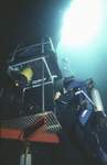 Inconvénient majeur de la solution retenue, pour manoeuvrer le palan il faut être en pleine eau. C'est le travail qui incombe aux plongeurs d'assistance. Pour un plus grand confort d'utilisation, sous la cloche nous avons installé un treillis métallique réglé de telle façon que debout, nous ayons le buste dans la cloche.