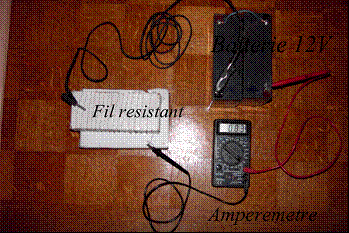 Déplacer l'extrémité de ce fil en enlevant quelques spires, jusqu'à trouver la valeur désirée ( 3, 4, 5, Ampères ) ( plus la longueur du fil résistant sera importante, moins l'Ampèremètre indiquera d'Ampères ).