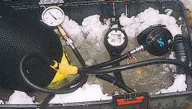 Après avoir rempli un récipient d'un volume adéquat d'eau douce et de neige et s'être assuré que la température de l 'eau est de 0° C, on plonge la bouteille et le premier étage à tester qui a été, au préalable, refroidie par son dépôt dans la neige. On connecte au premier étage un deuxième étage Scubapro, le R 190, un manomètre haute pression et un autre pour la pression intermédiaire. On note la pression de tarage du premier étage et celle de la bouteille.