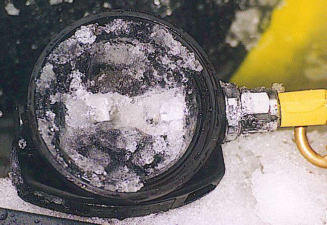 Le système de protection anti-givre employé par la marque suédoise depuis plusieurs années est un capuchon en caoutchouc qui protège la membrane et le ressort du premier étage. Selon le fabricant, ce capuchon doit être rempli de glycol (mélange de 50% de glycérine et de 50% d'alcool) ou de Vodka ou de toute autre liqueur à fort taux d'alcool. Remplir ce capuchon est plus facile à dire qu'à faire et cela demande pas mal d'habileté. D'autre part, les capuchons, assez fragiles, peuvent se fendre et se vider facilement sans enlever la protection latérale. C'est une rupture de stock qui nous a obligée à tester les deux Jetstream sans capuchon, l'un ayant percuté le plafond d'une grotte en plongeant avec une configuration dorsale et l'autre perdu en plongeant avec une configuration latérale.
